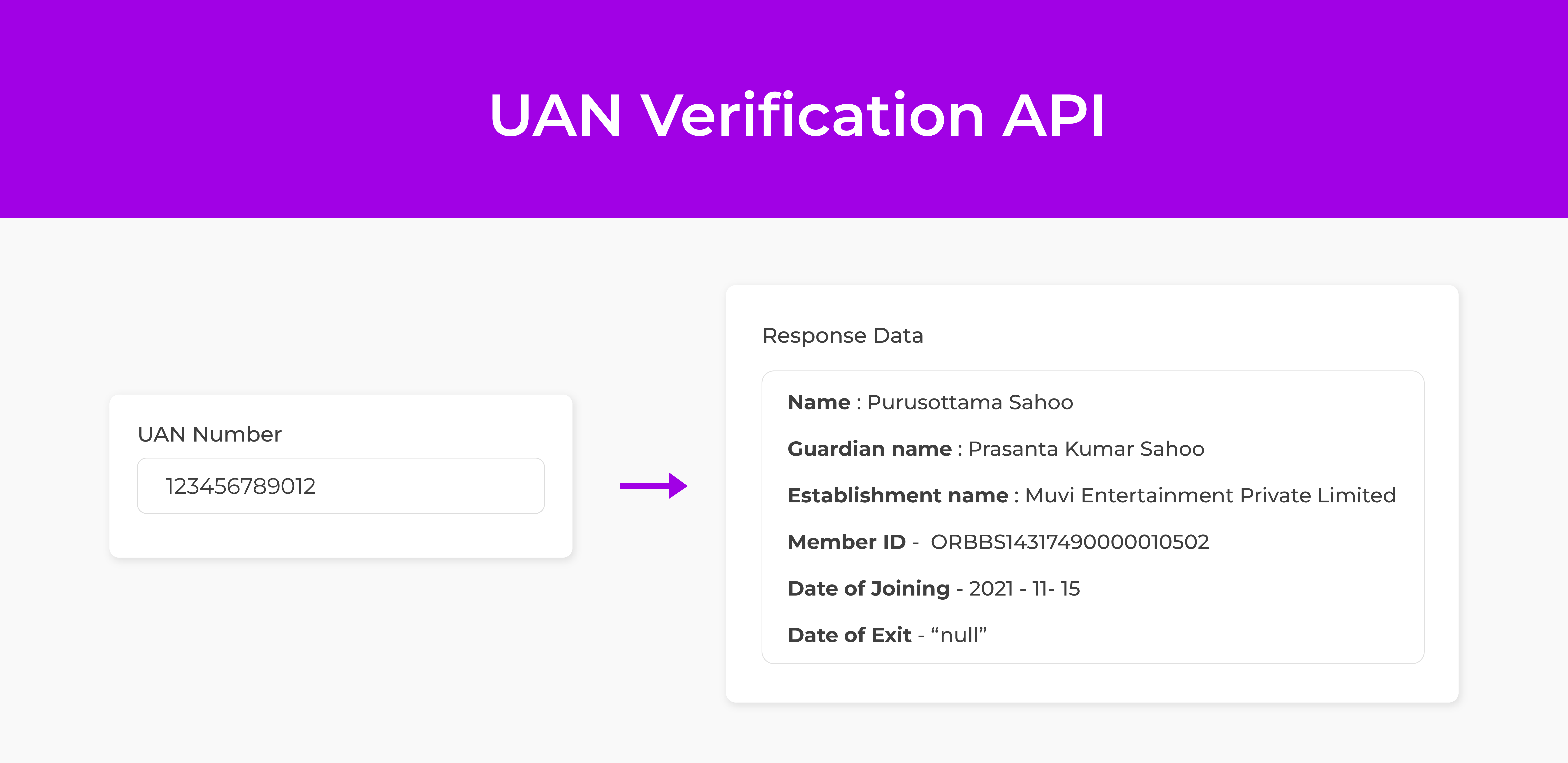 The UAN Verification APIs allows organizations to verify the authenticity of the UAN provided by the employees and check their employment history.